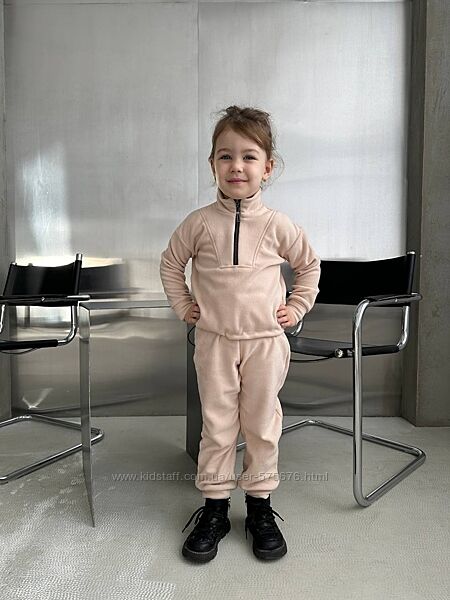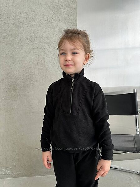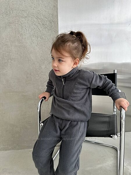 Флісовий костюм з горловиною, затяжками внизу та зі змійкою на шиї можна легко вдягнути під верхній одяг, завдяки термо властивості тканини він буде зігрівати діточок але не сковувати рухів.