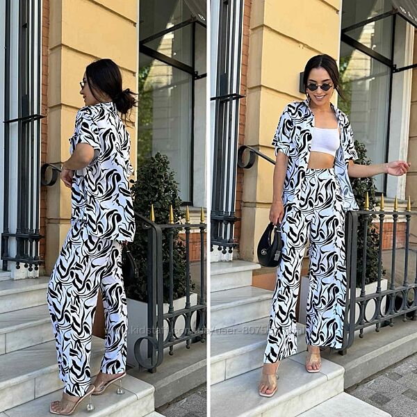 Костюм прогулянковий . Штани прямого крою, на резинці, висока посадка. Сорочка з розрізами по боках, спущений рукав. Застібається на ґудзики.