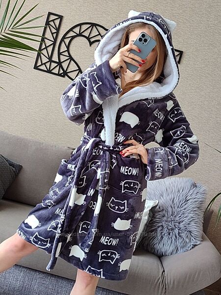М´якенький ніжний плюшевий халатик з капюшоном🔥Розмір: універсал 42-46 за рахунок запаху, довгі підходять до 48.