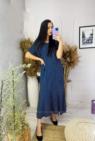 Красива сукня в смужку, р. 48, український бренд Selta. Бажаєте візуальної корекції?- наша сукня створить дива. Сукня класика, але з родзинкою, натуральна м,яка та щільна тканина, довжина міді, лаконічний волан по низу. Тоненька вертикальна смужка витягує силует та робить фігуру стрункішою, сзаду є потаємна блискавка. В наявності в синьому та чорному кольорі.р. 48 синє , (р. 48 чорне в замірах на 1-2 см меньше! )