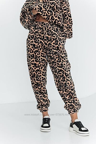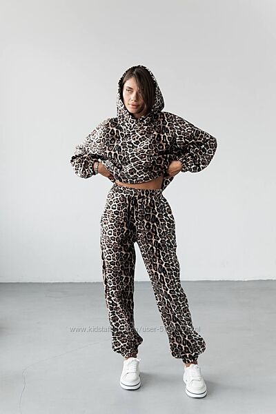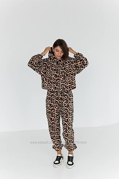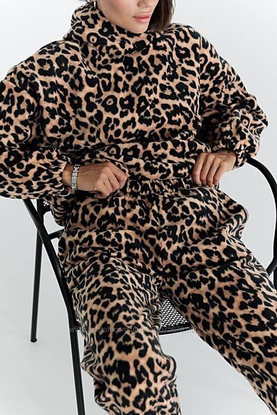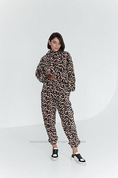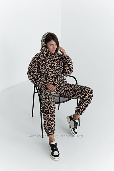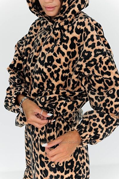 Представляємо флісовий костюм в трендовом прінті.Об´ємне худи внизу регулюється на лаштунках, джореги внизу на гумці.