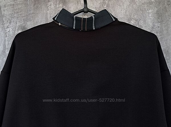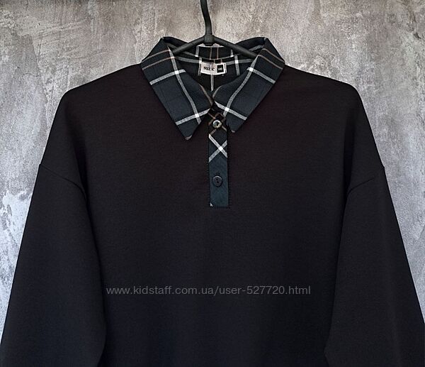 НАЛИЧИЕ ПО РАЗМЕРАМ УТОЧНЯЙТЕ ПОЖАЛУЙСТАТрикотажная укороченная кофта для девочек. Модель прямого свободного силуэта, рукава и низ изделия обработаны манжетами из кашкорсе, рубашечный воротник выполнен из костюмной ткани в клетку, спереди застежка на планке с пуговицами, плечевой шов приспущенный.