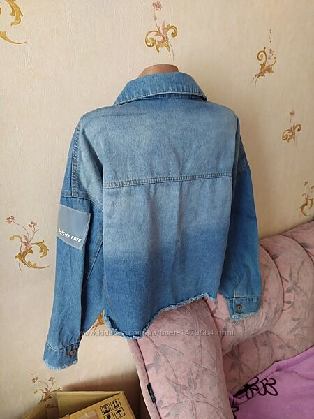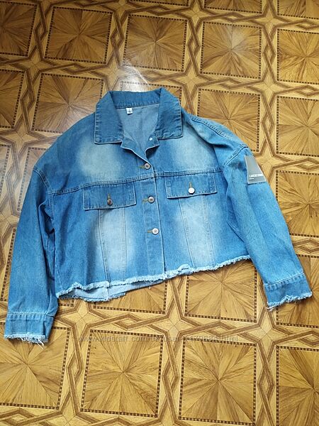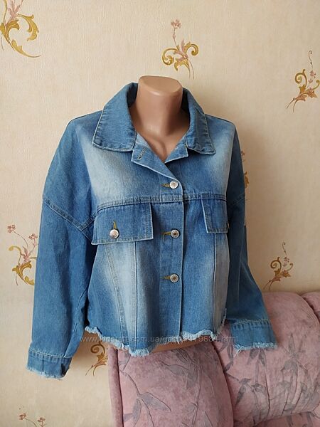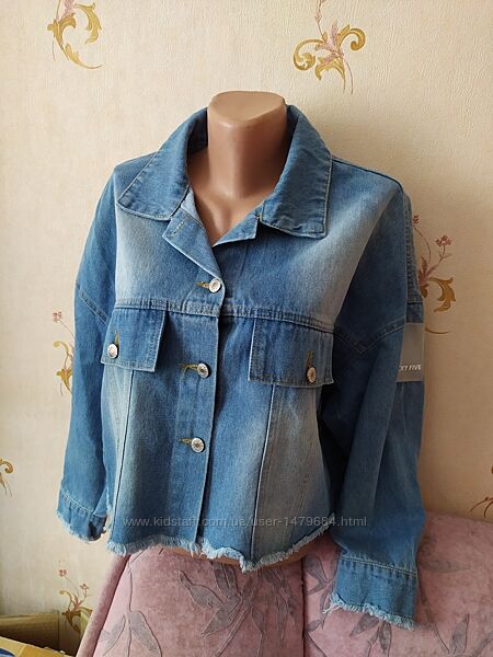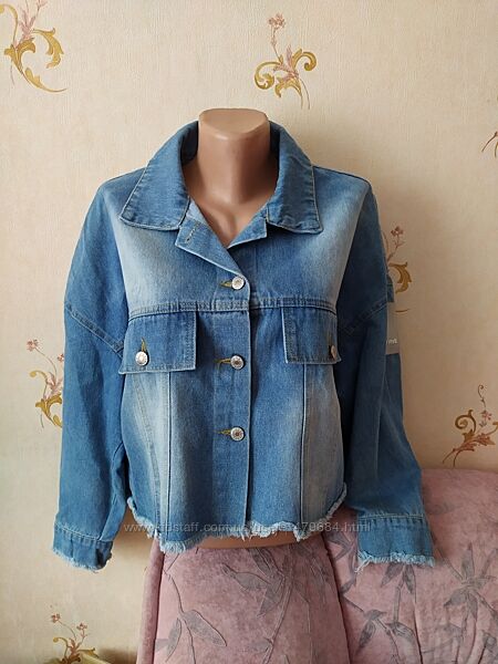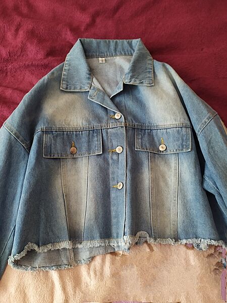 Укорочена жіноча джинсова куртка з обрізаним низом , Туреччина, розмір універсальний, йде на р. С/М. Обрізаний низ додає цій куртці особливий шарм і створює сучасний вигляд. Цей стиль куртки чудово поєднується з різним одягом. Куртка такого типу може бути ідеальним вибором для різних луків. Колір блакитний, кишені - обманки. Куртка оверсайз, тому ваші обєми повинні бути на багато менші. - напівобхват грудей - 58 см- довжина- 49 см