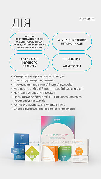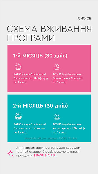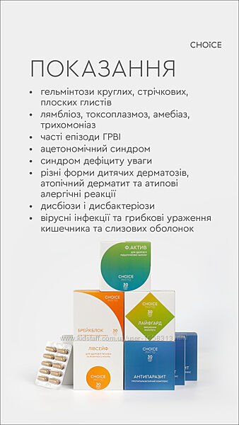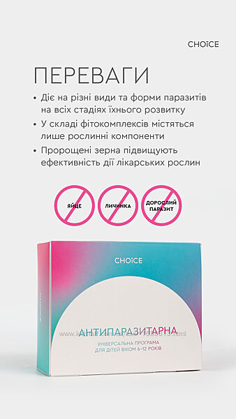 Дитяча Універсальна Антипаразитарна програма створена на основі фітокомплексів CHOICE PHYTO, які забезпечують повну дегельмінтизацію та очищення організму дитини від різних видів паразитів, вірусів і грибкової інфекції.