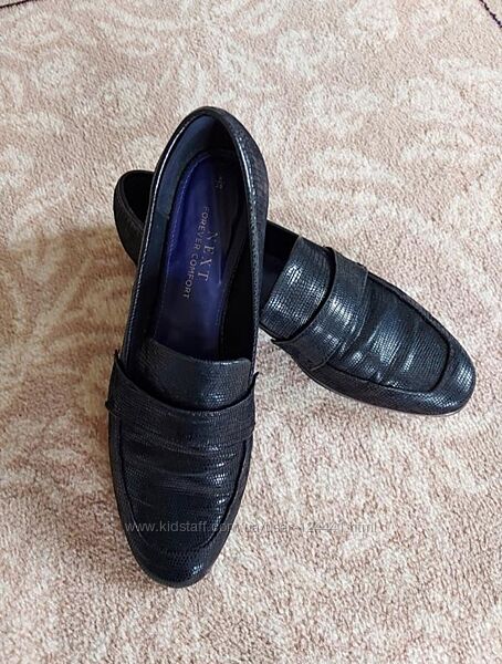 Стильні лофери, чорні туфлі на низькому ходу Next, р. 39. Повномірні, йдуть на р. 39-39,5.Стан ідеальний, фактично як нові. Дуже комфортні, устілка м´якенька, зручно сідають по нозі. Штучна шкіра з відблиском під рептилію. Носок трохи витягнутий, завужений - за рахунок цього виглядають елегантно та стильно. Устілка 26 см. Універсальне зручне взуття - підходять і до джинсів/штанів, і до спідниці/сукні. Якість англійського бренду Next.