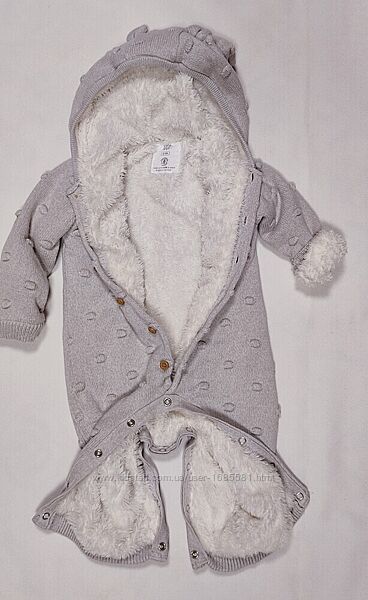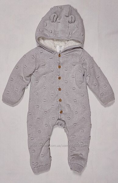 1) 9-12 месяцев демисезонный вязаный на меху комбинезон с капюшоном мишка с ушками fred flo-Теплый демисезонный детский комбинезон серого цвета