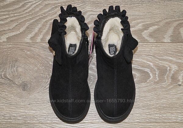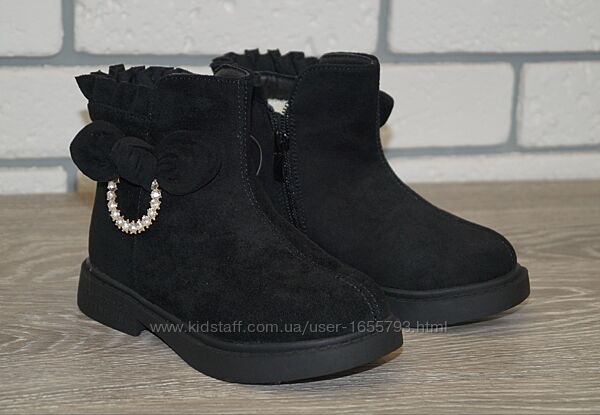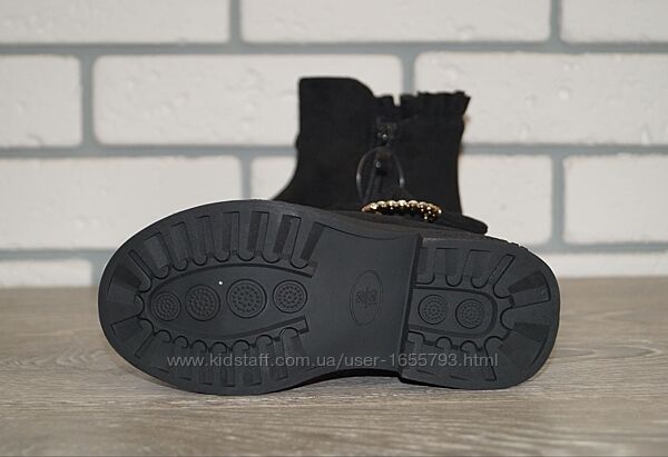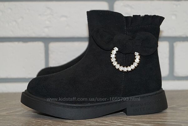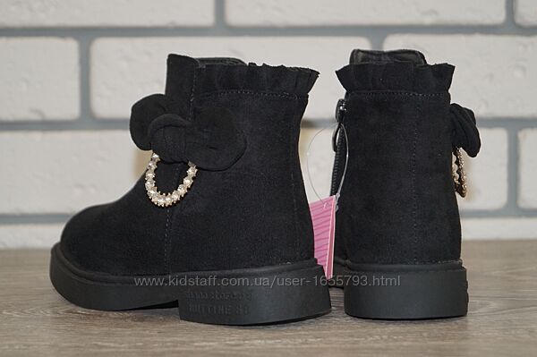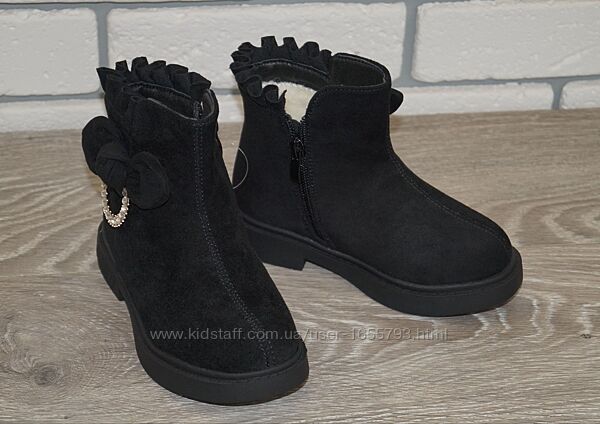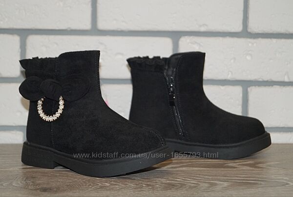 Брендова модель дитячих зимових черевиків. Універсальний чорний колір підійде до будь-якого вбрання дитини.Черевики пошиті із штучної замші високої якості. Всередині хутряна підкладка та устілка. Застібаються на зручну бічну блискавку. Підошва легка та антиковзна.
