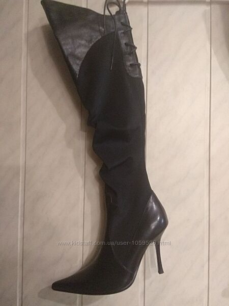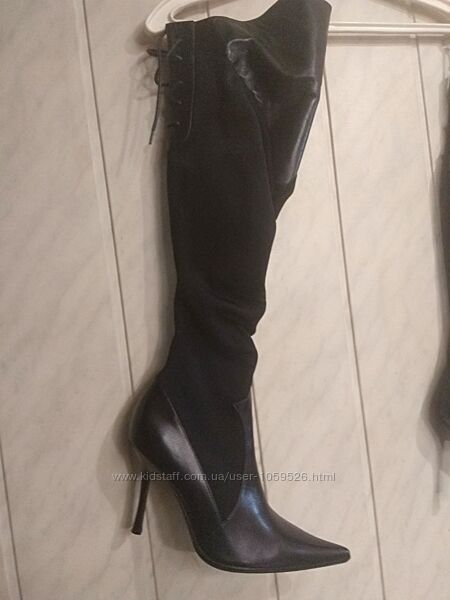 Ботфорты из натуральной кожи, комбинированные с плотной прорезиненной. На любую полноту .Модель с заостренной носовой частью, узким каблуком-шпилькой.