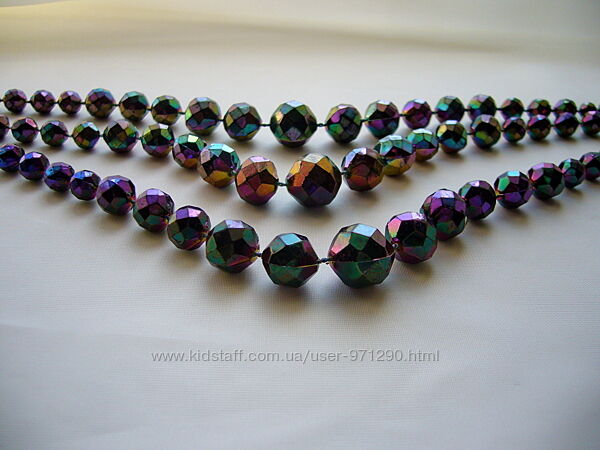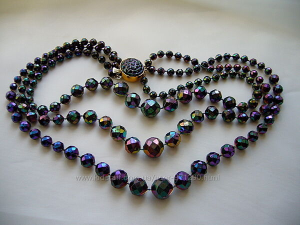 Чудесное трехрядное колье с характерным замочком, переливается оттенками фиолетового, зеленого, синего, бронзы (бензиновый эффект, эффект Аврора бореалис).Длина 45 см по самой короткой нити. На одной нити есть узелочек, на общий вид не влияет.