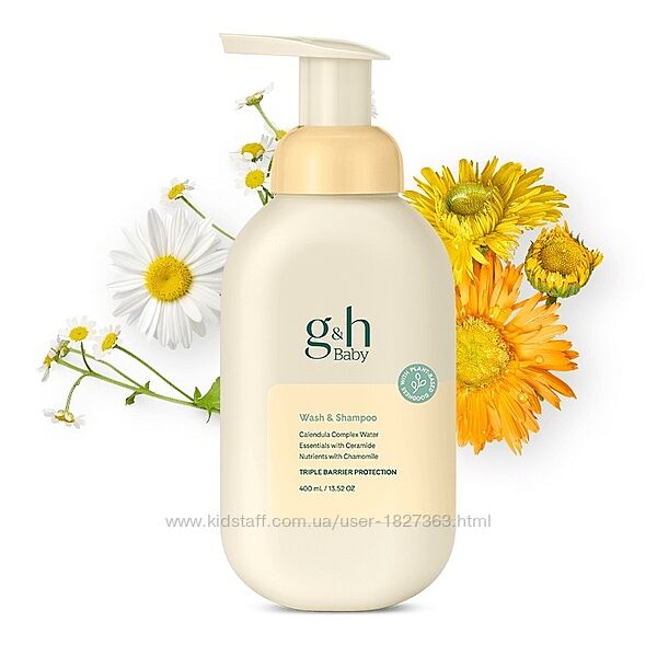 g&h Baby Дитячий шампунь для волосся та тіла містить вирощену Nutrilite ромашку, календулу та оливкову олію. Формула засобу збагачена фітокомплексом, який допомагає максимізувати користь усіх інгредієнтів.