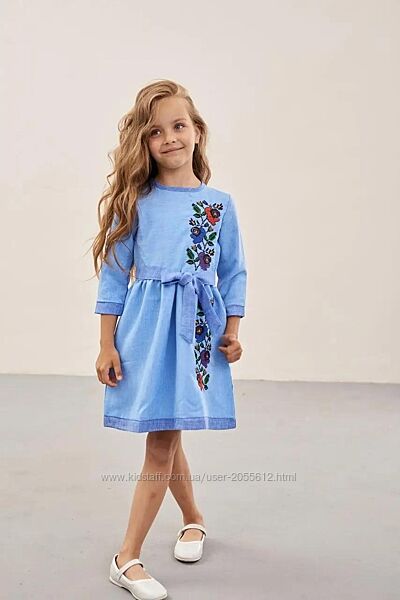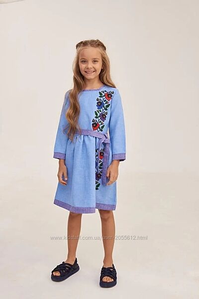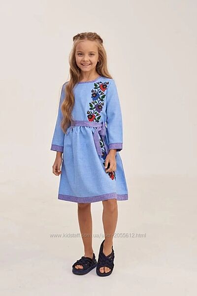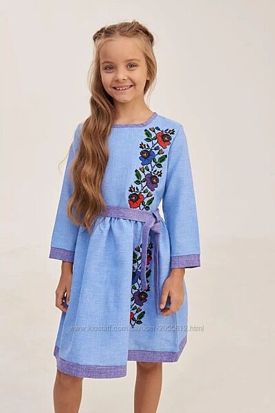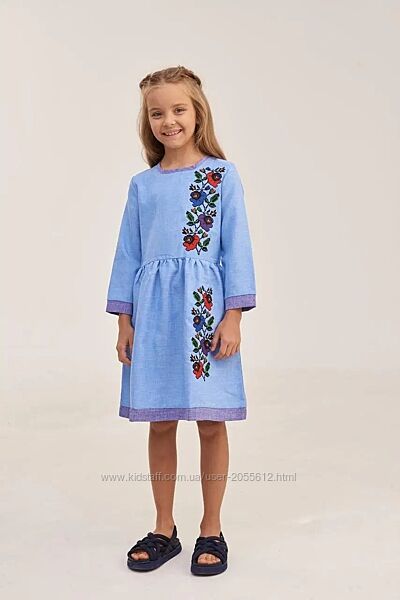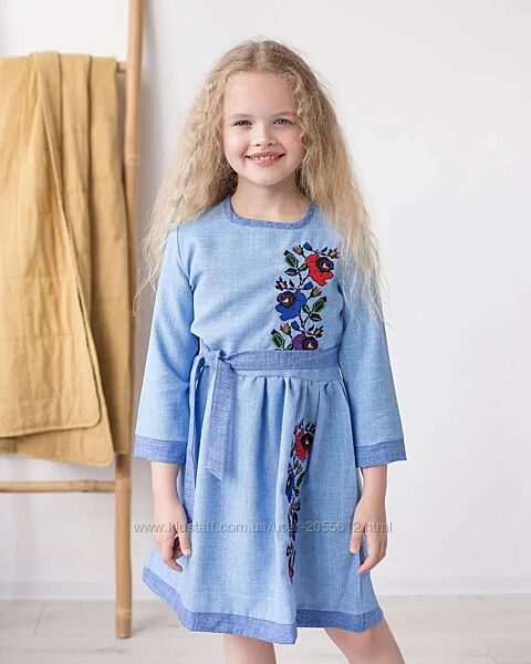 Дитяча сукня виготовлена з габардину блакитного кольору. Довжина до коліна, рукав три чверті. Низ і ліф сукні прикрашений вишитими квітами різних кольорів. Низ відрізний. Виріз, краї сукні і рукавів оброблені тканиною синього кольору.Розміри 104, 110, 116, 128, 146, 152