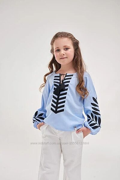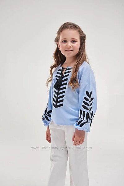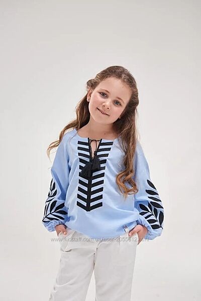 Дитяча блузка виготовлена з натуральної тканини блакитного кольору. Рукав довгий, широкий, знизу призібраний. Перед і рукав прикрашені листками папороті, вишитими чорними нитками. Виріз круглий, стягується чорним шнуром з кутасиками.Розміри 116, 122, 128, 134