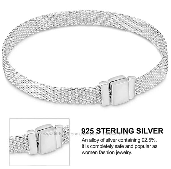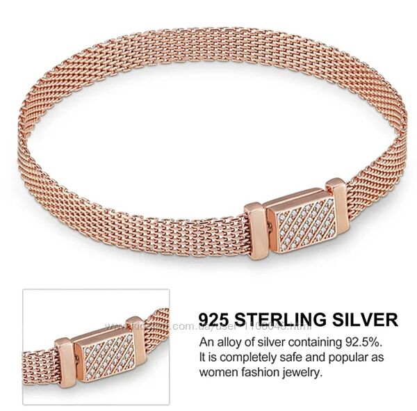 Срібні браслети репліки Pandora у 3-ох кольорах - рожевий, лимонний, срібний (1-7 фото).Браслети вкриті родієм, що надає їм благородного відтінку. Браслет має сітчасту структуру, що надає йому легкості, витонченості та гнучкості. Застібка браслета виконана у вигляді прямокутної пластини, (у рожевому кольорі - інкрустованої фіанітами). Проба вказана на застібці Завдяки своєму дизайну браслети підходить для повсякденного носіння та можуть стати доповненням до будь-якого образу.