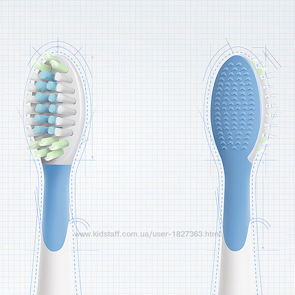 Крім того, інноваційний дизайн щетини з трьома видами щетинок сприяє цілеспрямованому чищенню поверхні зубів, лінії ясен та міжзубних проміжків. Також на зворотному боці змінної насадки розташований вбудований очищувач язика для завершення щоденної процедури догляду за ротовою порожниною.