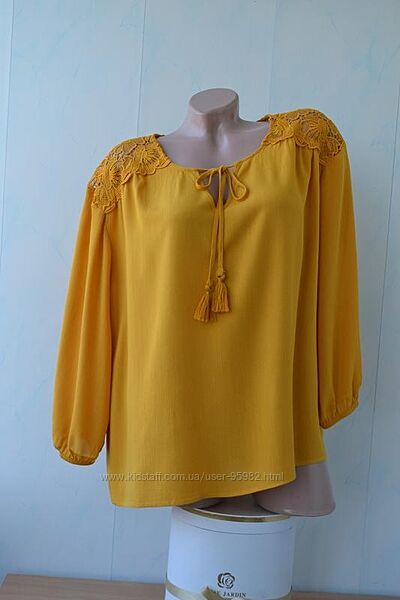 Ніжна, красива блуза з мереживними вставками F&F, зі 100% віскози. Приємна до тіла, добре пропускає повітря, підійде як під шорти, так іпід джинси. На бирці розмір 18, сяде і на 20. Орієнтуйтеся за замірами.