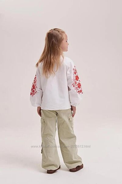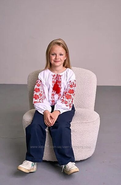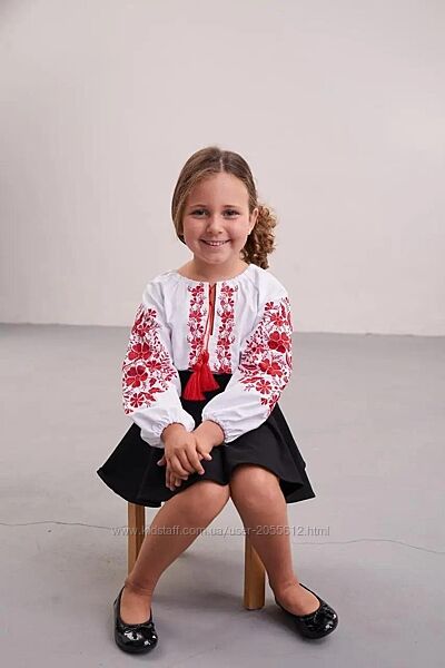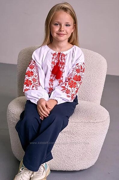 Вишиванка для дівчинки виготовлена з натуральної тканини білого кольору. Рукав довгий, широкий, знизу призібраний резинкою. Перед і рукав прикрашені вишитими букетами квітів червоного кольору.Виріз круглий, зібраний шнурком з червоними китицями.Розміри 110, 116, 122, 128