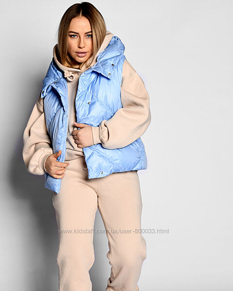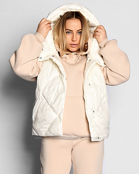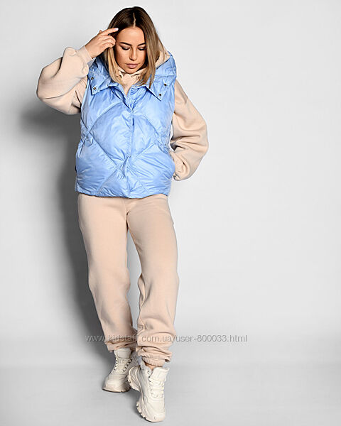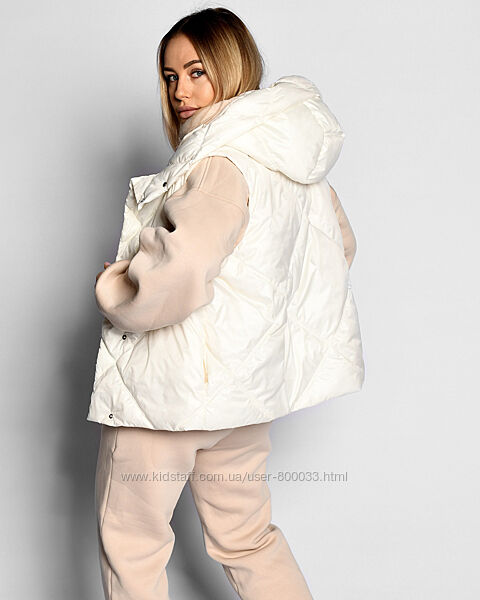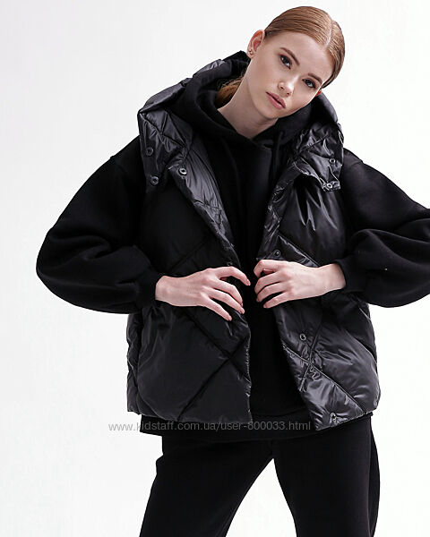 Жіночий стьобаний жилет. Модель прямого силуету з коміром, який переходить у глибокий капюшон. Має бокові кишені та застібку на кнопки. Ідеально підходить під будь-який верх, у тому числі об´ємні худі.