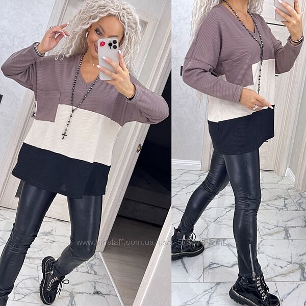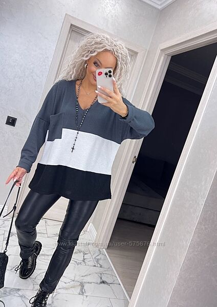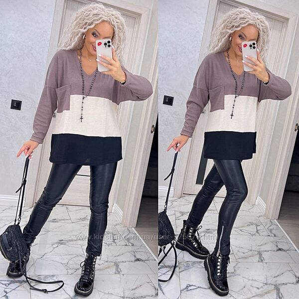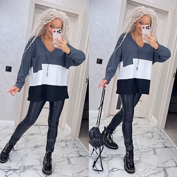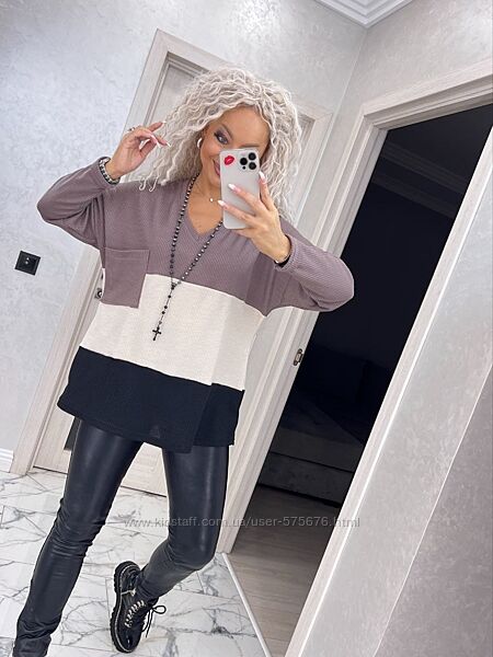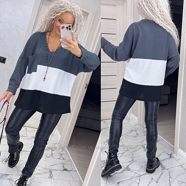 Кофтинка вироблена з якісного трикотажу, приємного до тіла. Модель вільного крою, рукав реглан. Пройма широка, добре підійде на повну ручку. Гарне поєднання кольорів.
