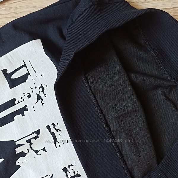 284. Світшот новий, з біркою, без нюансів. Колір насичений чорний, на моїх фото засвічений. Тканина щільна, слабо тягнеться, не утеплена. Бавовна. Розмір М.Плечі 35 см,