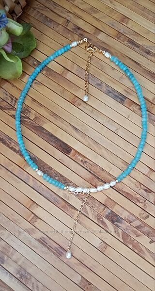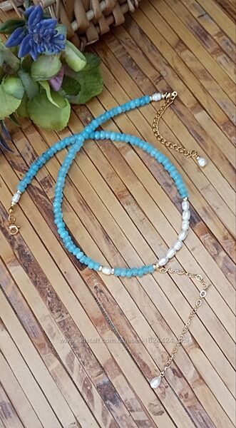 З намистин тонованого кварцу(імітація аквамарину) та натуральних перлин