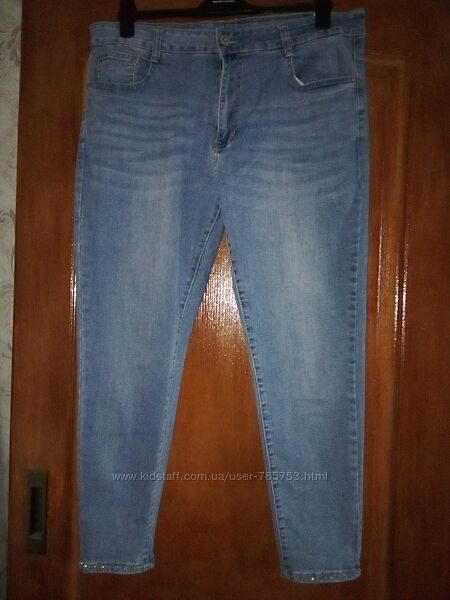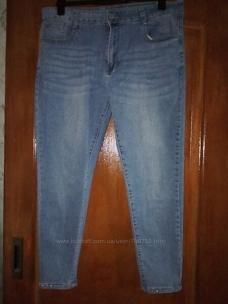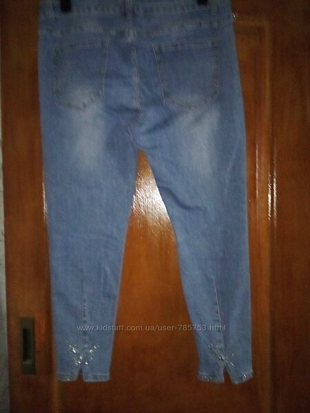 Гарні, стрейчеві, низ прикрашен камінцями. ПІТ 48 см---56 см, ПІС 59 см-- тягн. до 70 см, довжина 93 см/ 65 см, посадка 30 см/ 40 см, штанина 30-- тягн. до 38 см і низ 15 см--- тягн. до 20 см. Між ногами потертостей немає.Не секонд.