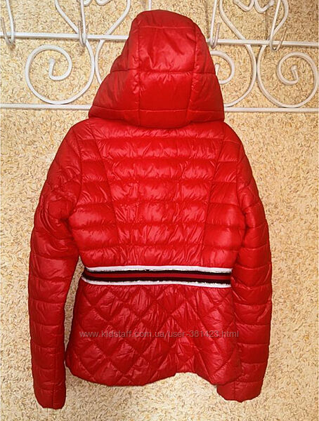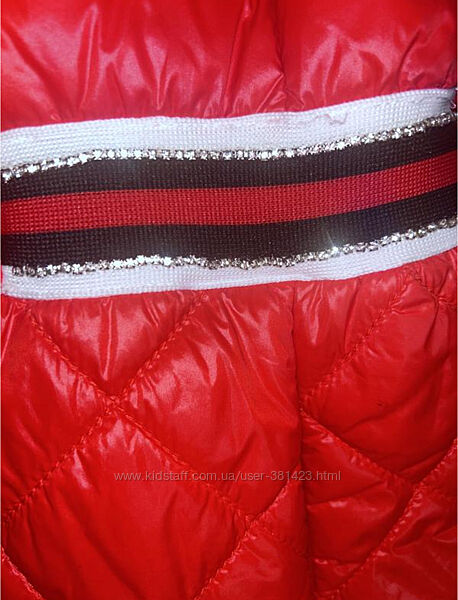 Жіноча стьобана куртка з капюшоном та з триколірним кантом - якісна і легка, злегка утеплена, універсального кольору. Класичний крій до лінії стегон.Куртка урізноманітнена стрічкою з камінцями по талії. Барвиста смужка надає їй елегантного характеру та відповідає останнім тенденціям моди.