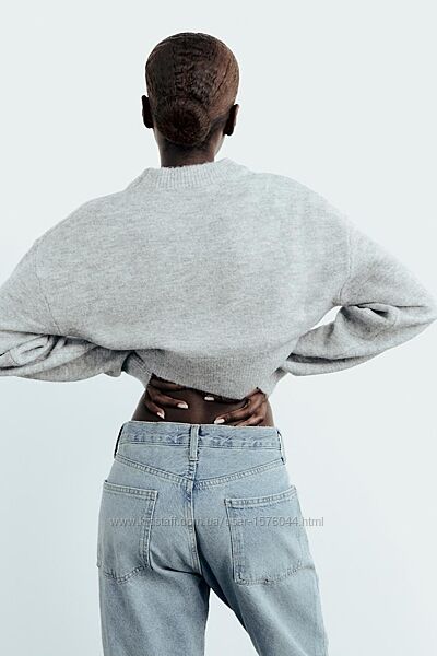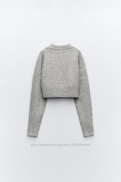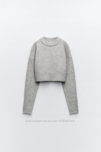 Укороченный свитер с круглым воротником и длинными рукавами. Окантовка в рубчике по краям.