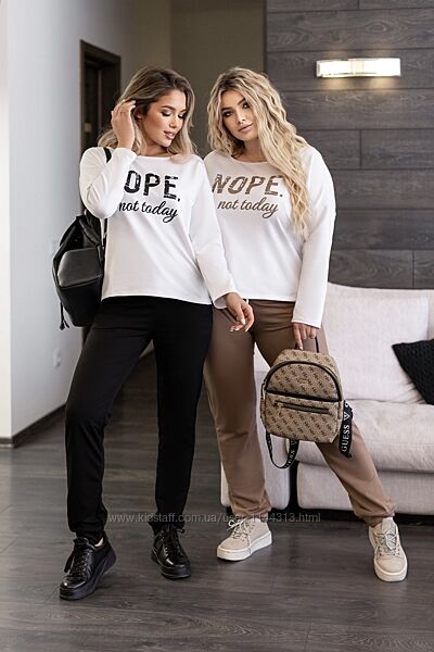 Особливий акцент — стильний декор у вигляді напису на грудях, виготовлений у тон штанів, що надає гармонійності всьому комплекту.