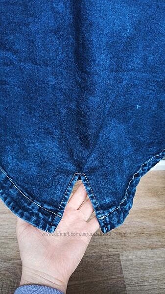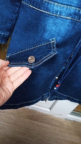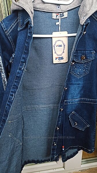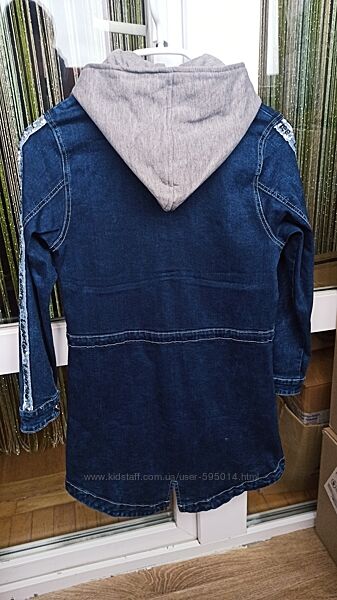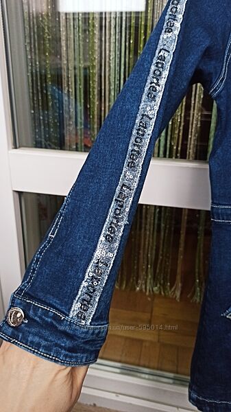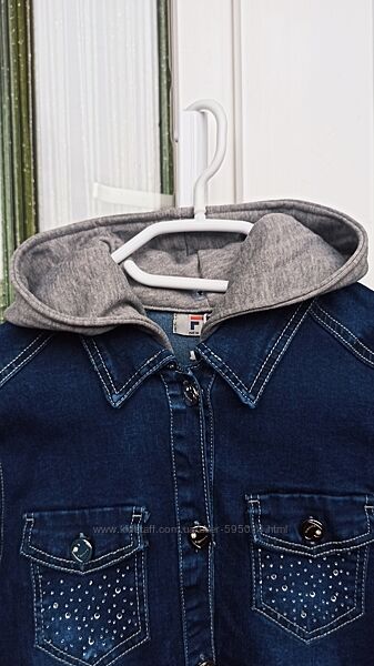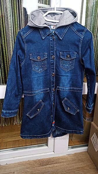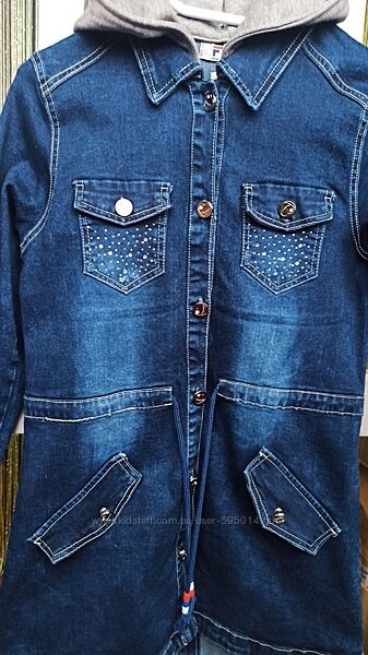 Новая удлиненная джинсовая курточка на девочку 12 лет рост 146-152 см. С бирками!Капюшон тканевый съемный (на пуговицах). Курточка застегивается на пуговицы. На талии регулировка ширины. Рукава украшены тесьмой с пайетками. Два верхних кармана рабочие, украшены стразами. Два нижних кармана - обманки. Рукава с манжетами. Зад длиннее переда.