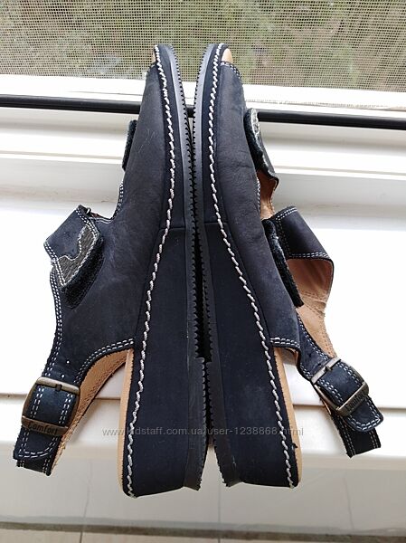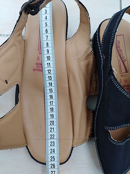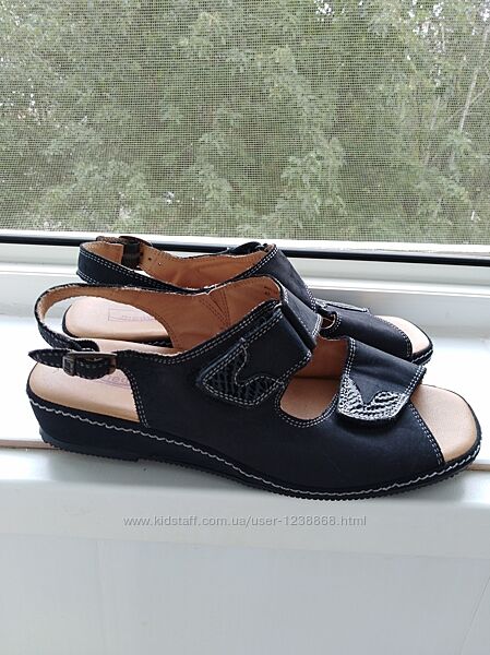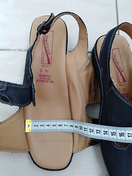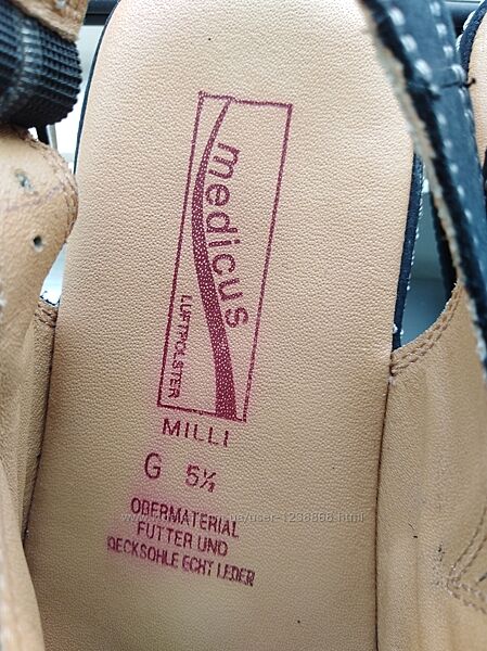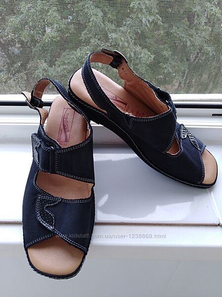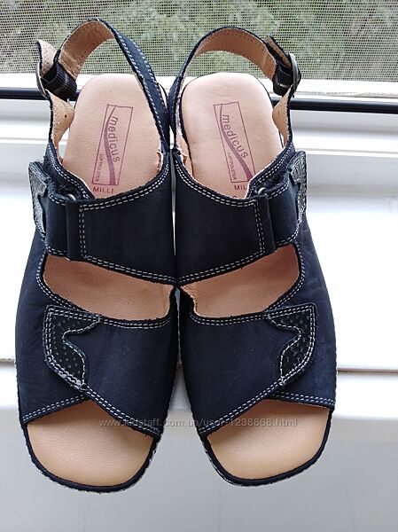 Ортопедические кожаные босоножки от medicus.Верх босоножек из натурального нубука,внутри натуральная кожа, ортопедическая стелька, застёжка на липучке.Размер 38,5 ,стелька 25,5см.высота танкетки в районе каблука 3 см.