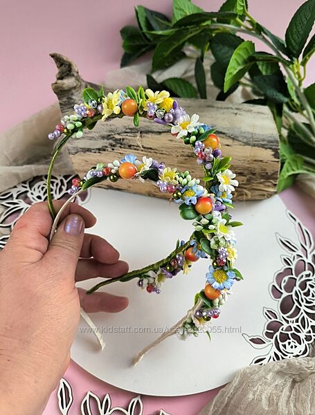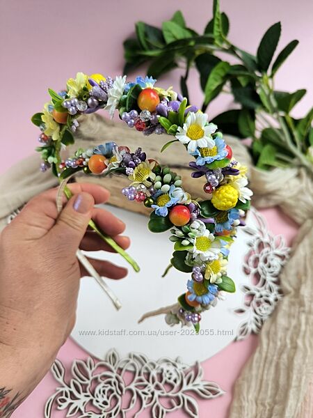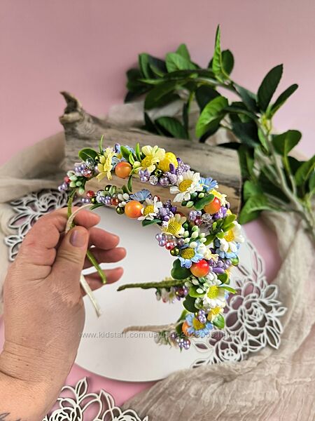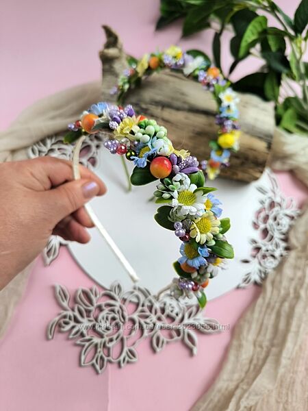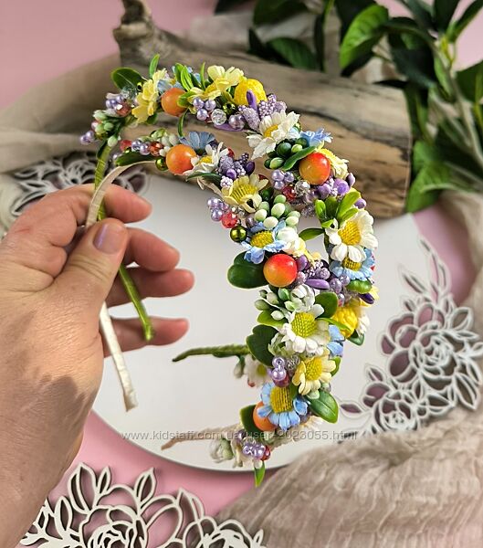 В наявності!Обруч з маленькими ромашками, зеленню , ягідками та гілочками з кришталевих бусинок!