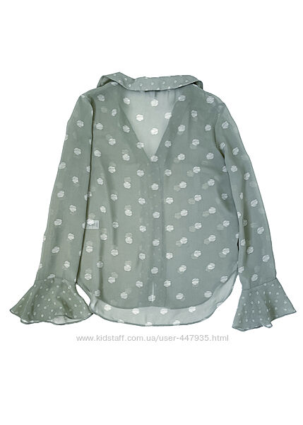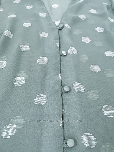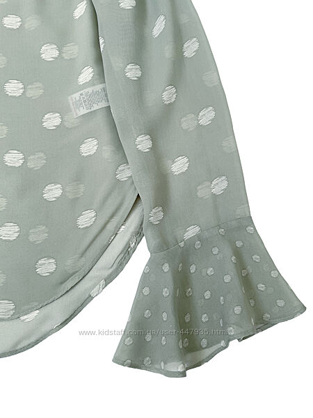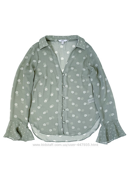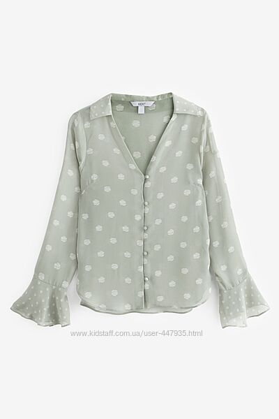 Чарівна блузка з напівпрозорої шифонової тканини з оригінальним принтом у горох від бренду Next.Блузка виконана в ніжному і стильному кольорі зеленої шавлії (трендовий сіро-зелений колір).