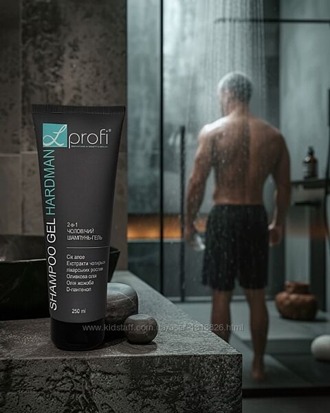 ШАМПУНЬ-ГЕЛЬ ДЛЯ ДУШУ "HARD MAN" 2 -В -1 ЧОЛОВІЧИЙ серії L´PROFI, 250мл - 215 грн.Оновлена м´яка фіто-формула для чоловіків 2-в-1 з соком алое вера, оліями оливи та жожоба, екстрактами лікарських рослин (череди, ромашки аптечної, календули, подорожника) та провітаміном В5 (D-пантенолом) м´яко і якісно очищає волосся та шкіру від ороговілих клітин, забруднення, а також зволожує та пом´якшує шкіру тіла, повертаючи приємне відчуття тонусу, свіжості. Має виражений дезодоруючий ефект.
