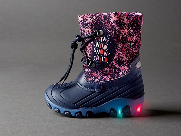 Чоботи-сноубутси Німецької фірми Lupilu® з підсвічуванням. З класним мерехтливим ефектом – кожен крок змушує підошву світитися. М´яка, тепла внутрішня підкладка. Ідеальні на погоду з мокрим снігом. Найкраща видимість завдяки світловідбивним елементам 3M Scotchlite™. Міцна профільована підошва. Практична проста шнурівка зі стопорами для легкого надягання та зняття. Підсвічування може не працювати, оскільки в процесі доставки може розрядитися живильний елемент. Не працюєюче підсвічування не вважається браком.Заміри: Устілка: 18,5 см