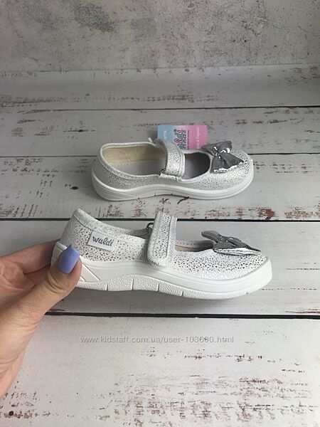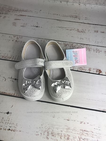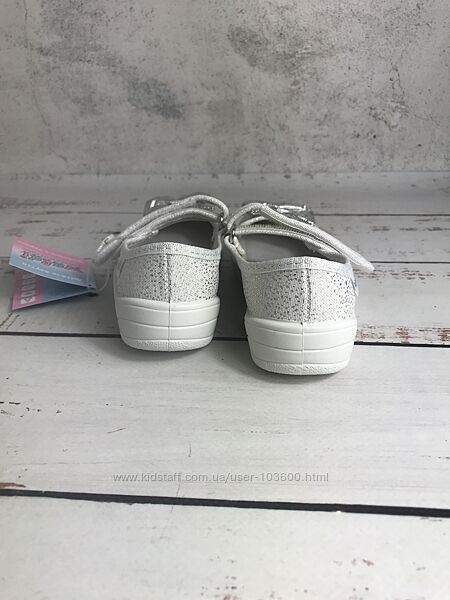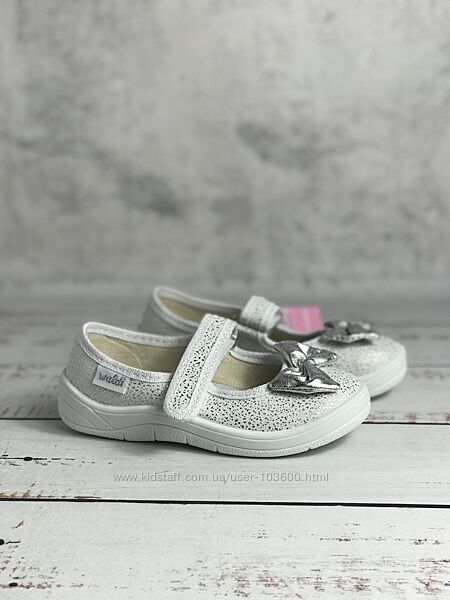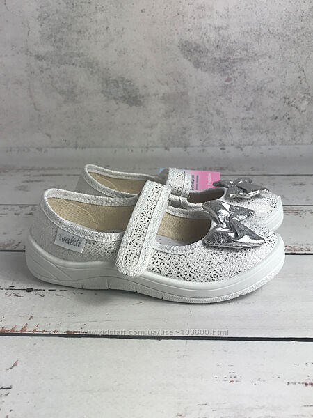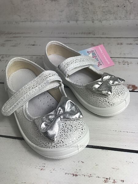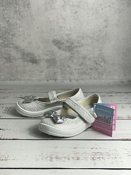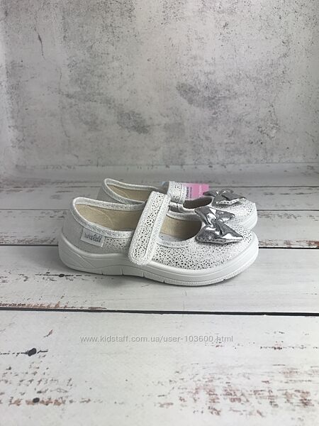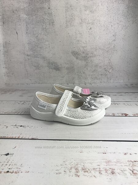 Створені з натурального дизайнерського текстилю, дихаючого, гіпоалергенного, легкого та простого у догляді матеріалу, білого кольору з блискітками та милим срібним бантиком в якості декоруВсередині також текстиль та знімна устілка з супінатором з натуральної шкіри, яка створює комфортний мікроклімат і не дає ніжці залишатися вологою