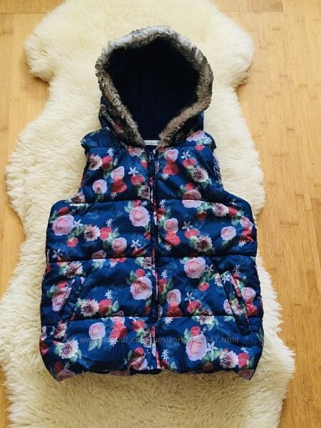 9-10 рок. M&CO kids. брендова об´ємна жилетка на флісі з капюшоном, оздоблений штучним хутром, Тепла, демісезонна безрукавка для дівчинки. яскравий квітковий принтз якісної водовідштовхуючоі плащівки на молнії.