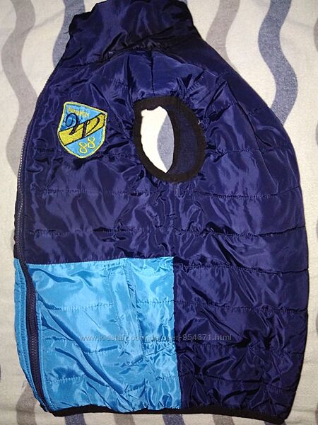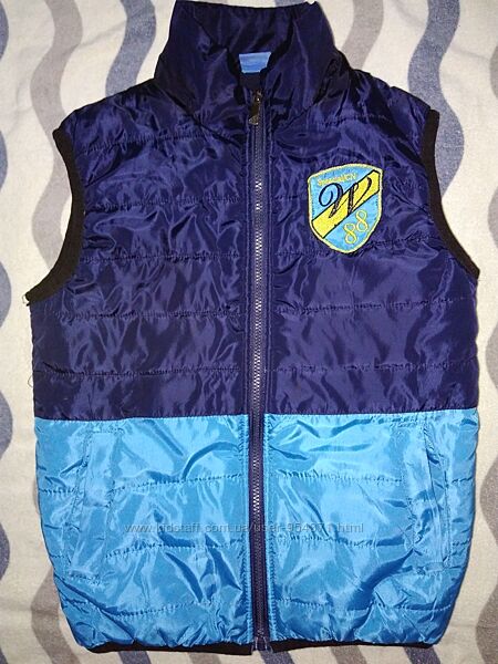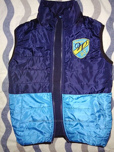 Классный стеганный жилет, безрукавка на 12лет р.146-152Состояние и качество отличнейшее, без ньюансов, цвет комбинированный темно-синий с голубым, высокая стоечка под горло, без капюшона, очень даже удобно, обычно одеваешь на толстовку с капюшоном. Верхняя ткань мягенькая плащевка, не блестящая, не шуршащая, внутри утеплитель-синтепон, подкладка -флис. Низ безрукавки и пройма -тонкая резинка. Жилет легкий, удобный и комфортно теплый.