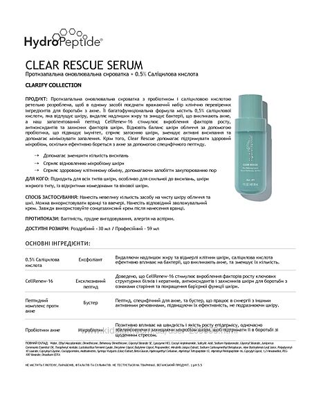Протизапальна оновлювальна сироватка з пробіотиком і саліциловою кислотою ретельно розроблена, щоб в одному засобі поєднати вражаючий набір клінічно перевірених інгредієнтів для боротьби з акне. Її багатофункціональна формула містить 0,5% саліцилової кислоти, яка відлущує шкіру, видаляє надлишки себуму та знищує бактерії, що викликають акне, а наш запатентований пептид CellRenew-16 стимулює вироблення факторів росту, антиоксидантів та захисних факторів шкіри. Відновіть баланс шкіри обличчя за допомогою пробіотика, що підвищує імунітет, сприяє загоєнню шкіри, зменшує активні висипання та допомагає мінімізувати запалення. Крім того, Clear Rescue допомагає підтримувати здоровий мікробіом, оскільки ефективно бореться з акне за допомогою специфічного пептиду.Допомагає зменшити кількість висипаньСприяє відновленню мікробіому шкіриСприяє здоровому клітинному обміну, допомагаючи запобігти закупорюванню порДля кого: Підходить для всіх типів шкіри, особливо для схильної до висипань, шкіри жирного типу, із відкритими комедонами та вікової шкіри.