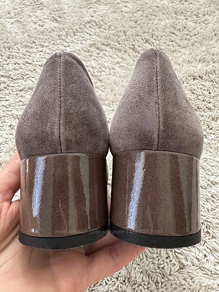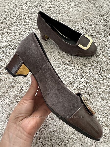 Дуже гарні туфлі із натурального замшу. Взуття зручне, на маленькому стійкому каблуці, устілка мягенька на подушечці, підошва не скользить. Стан ідеальний, жодних нюансів.Розмір 36