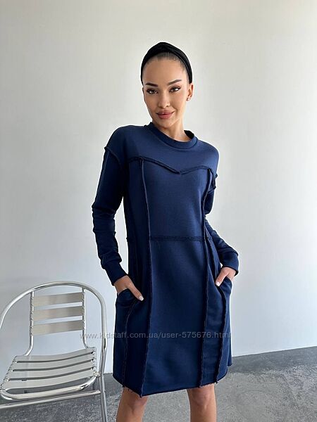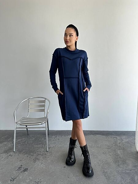 Трикотажна сукня , із якісної турецької трьохнитки петлі - пеньє ЛЮКС ЯКОСТІ . Комір та манжети на рукавах із рібани в колір . Виріб має дві кишені . Декорований акцентними швами , що роблять талію вужчою , а силует виразнішим . Для більшості видів фігур .