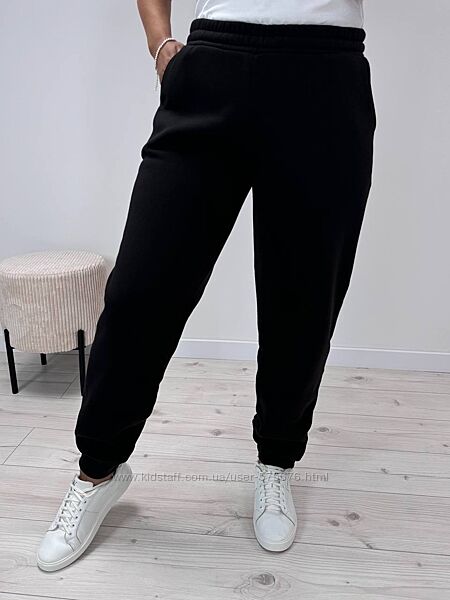 Штани із теплої тринитки на флісі, з кишенями, висока посадка. Внизу манжет, талія на резинці та всередині затягується на шнурок.