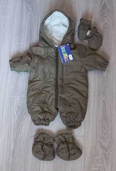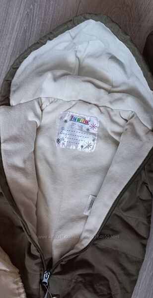 Демісезонний комбінезон Lupilu для найменших. Всередині утеплений флісом.царапки і пінетки пристібаються на кнопки і легко одягаються\знімаються. Є мішечок для їх зберігання. По всій довжині застібається на блискавку. Зверху захист для підборіддя.