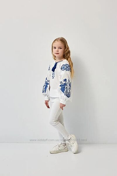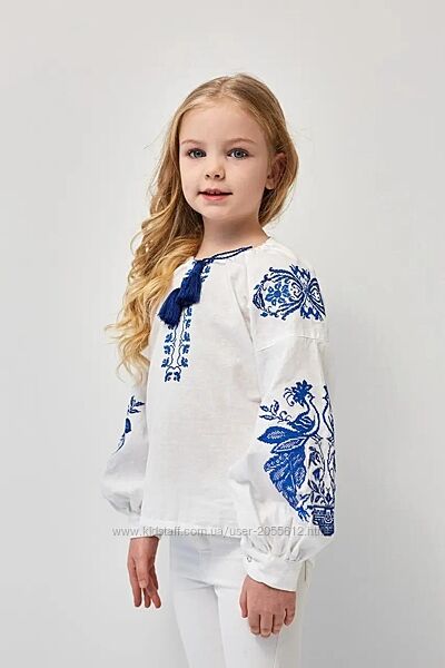 Вишиванка для дівчинки виготовлена з бязі білого кольору. Рукав довгий, широкий, знизу призібраний резинкою. Перед і рукава прикрашені вишитими жар-птицями синього кольору. Виріз круглий, стягується синім шнурком з китицями.Розміри 116, 122, 134, 140