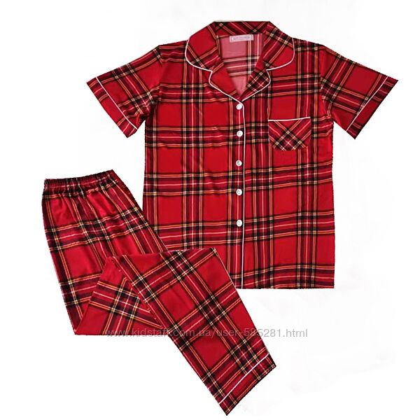 комфортная к телу и уютная пижама с принтом в клетку, рубашка с коротким рукавом на пуговичках, украшает окантовка контрастного цвета, штаны свободного прямого кроя с поясом на резинке, размеры 46-54-