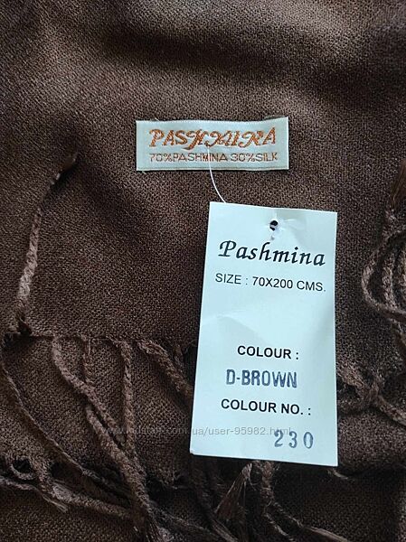 Палантин , шарф Pashminа, 70% пашмина, 30% шелк. Богатый шоколадный цвет как на первом фото на вешалке, оригинал. Состав легко проверитьпроведя по шарфу влажной рукой, собирается шерсть, и характерно горит,