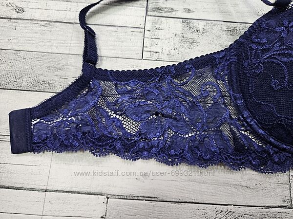 Розкішне чорнильно-синє італійське мереживо оздоблює чашки виробу.