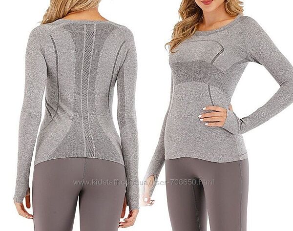 спортивный бесшовный лонгслив очень эластичный. растягивается на 4-10 см со всех сторон профессиональная спортивная ткань быстросохнущая и воздухопроницаемая облегающий силуэт и круглая горловина, длинные рукава с прорезями для пальца. цвет серый размер L параметры без растяжки : ПОГ 42 см, длина 68 см