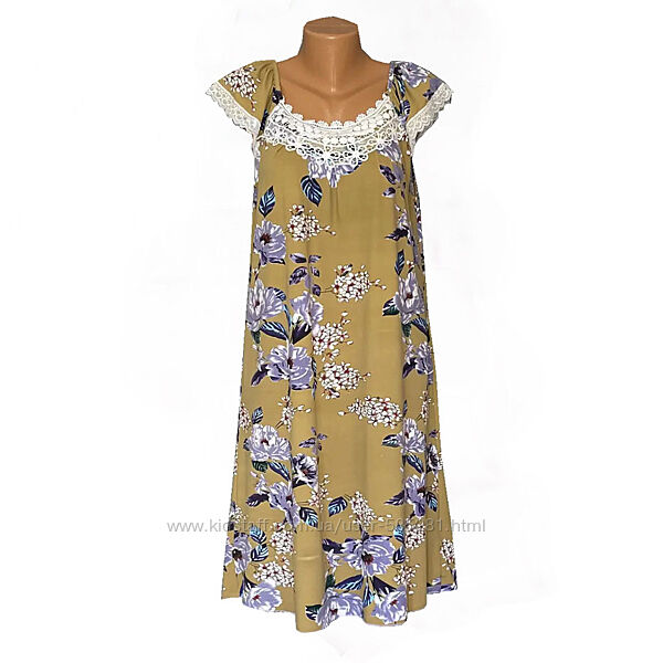 женская ночная рубашка с красивым принтом, трикотаж, приятная и уютная, рукав крылышки с кружевом, вырез полукруглый, украшенный кружевом макраме, размеры л-5хл-