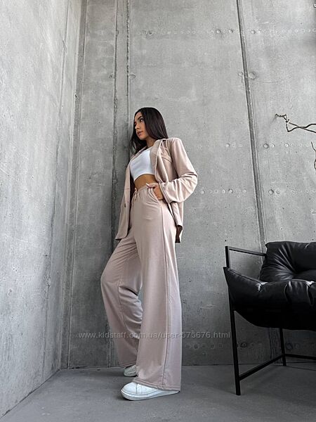 Жіночий костюм з піджаком та спортивними штанами поєднує в собі елегантність та комфорт. Піджак та штани мають бути структурованим та вільними.Цей стиль зазвичай підкреслює активний образ і може бути доповнений кросівками чи підборами залежно від ситуації.Ціна 950 грн.