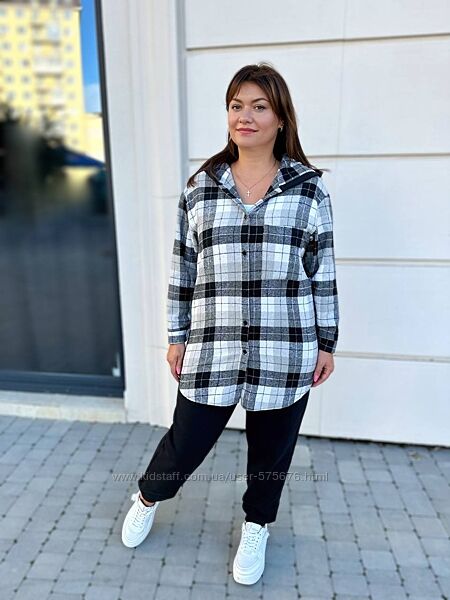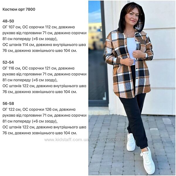 Костюм сорочка + штани. Сорочка на ґудзиках, із капюшоном подвійним, довгий рукав на манжеті,на ґудзику. Штани високої посадки,з кишенями. Талія на резинці, знизу манжет.